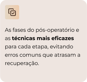 Serão 2 dias imersivos pelo mundo do pós-operatório onde você terá acesso a técnicas validadas que utilizei em centenas de atendimentos, e o mais importante: você vai aprender como escolher a melhor abordagem para cada fase do pós.